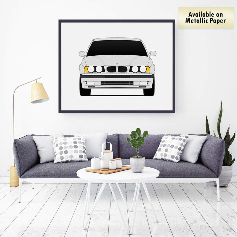 Poster print of the BMW M5 E34. The BMW E34 M5 is a handsome car that has the right amount of subtlety to fly under the radar and the right amount of M to do it at high speed.