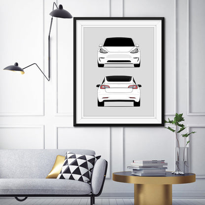 Poster print of the Tesla Model 3. With exhilarating performance, four doors, and a reasonable price point, the Tesla Model 3 is set to redefine the electric vehicle market.