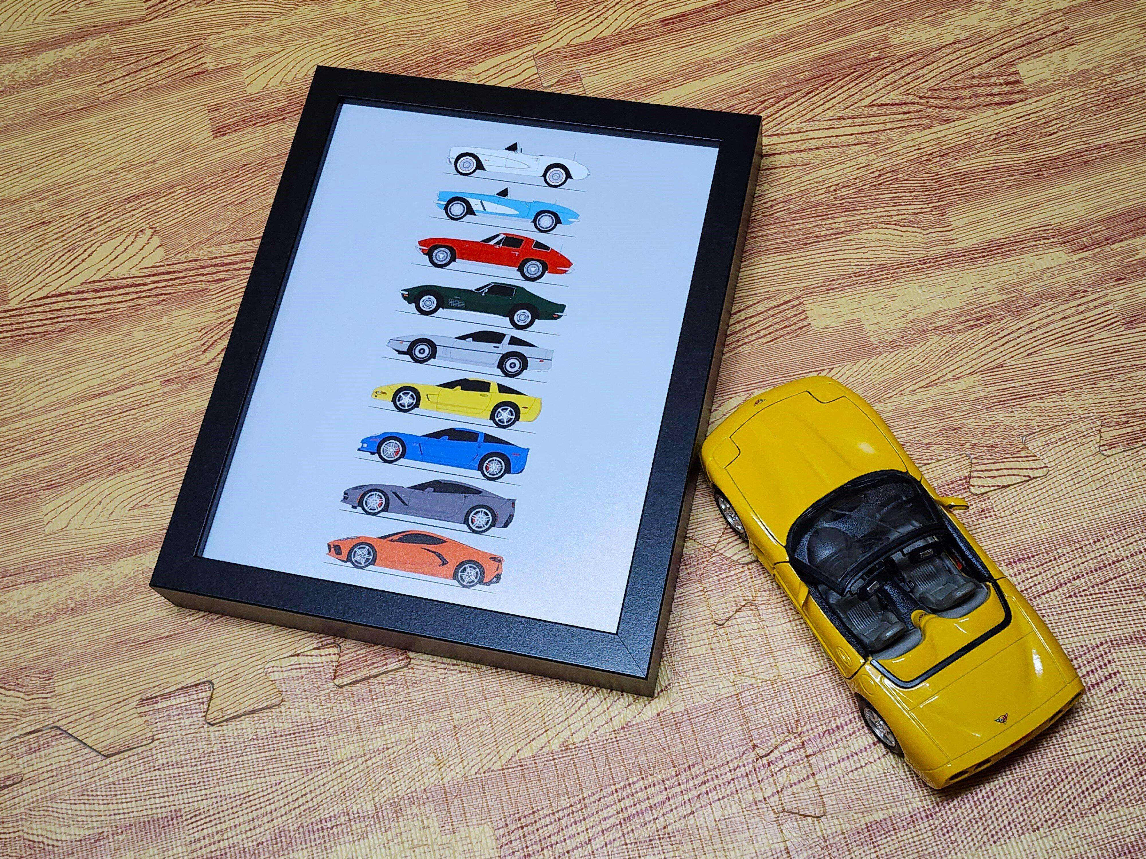 Decorate your walls with this poster print inspired by the complete history and evolution of the Chevy Corvette, one of the most iconic American Cars of all time.